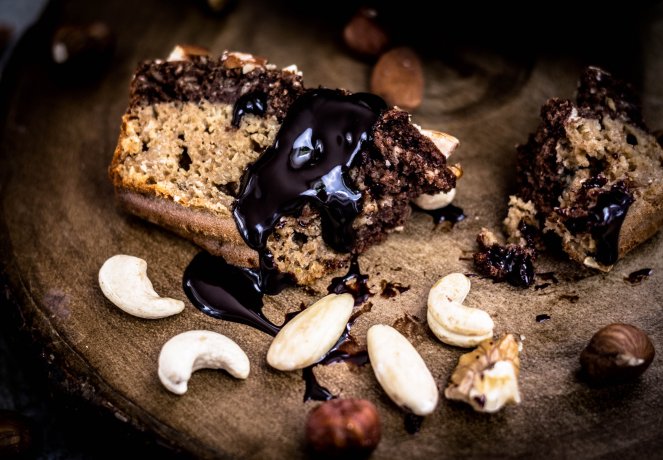 Unter die restliche Masse kommt dann noch der Backkakao und einen Schuss Milch (bei Bedarf noch einen Tl Süsse).Gib den dunklen Teig jetzt auf die helle Masse und toppe ihn mit den gehackten Nüssen deiner Wahl.