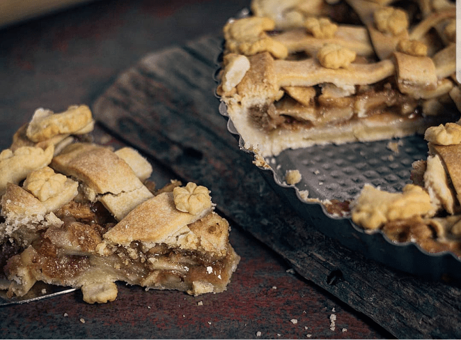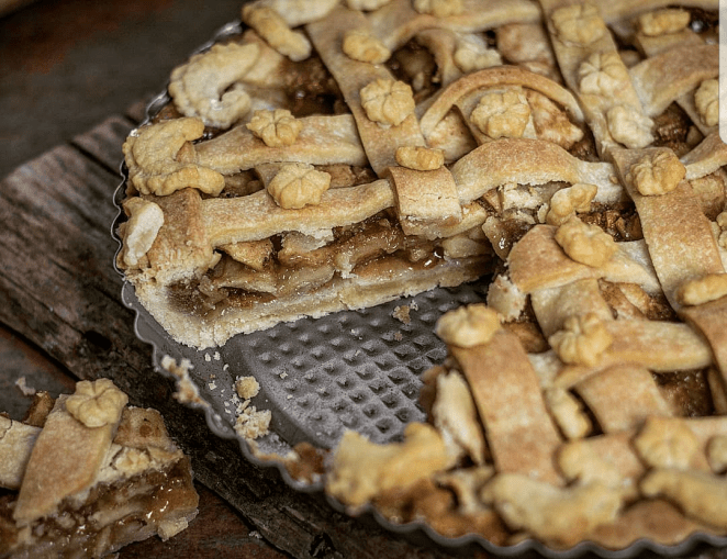Pieform aus dem Ofen holen und die Apfelmasse darauf verteilen. Dann je nach Bedarf und Lust mit einem Muster aus Teig verzieren und nochmal für ca.45-50min bei 180°C durchbacken (je nach gewünschter Bräune auch länger).