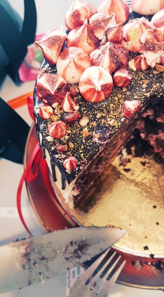 Ich habe eine Drip Cake Brownietorte mit Granatapfel Rosenwasser Creme Füllung und Meringue Swirls gebacken.