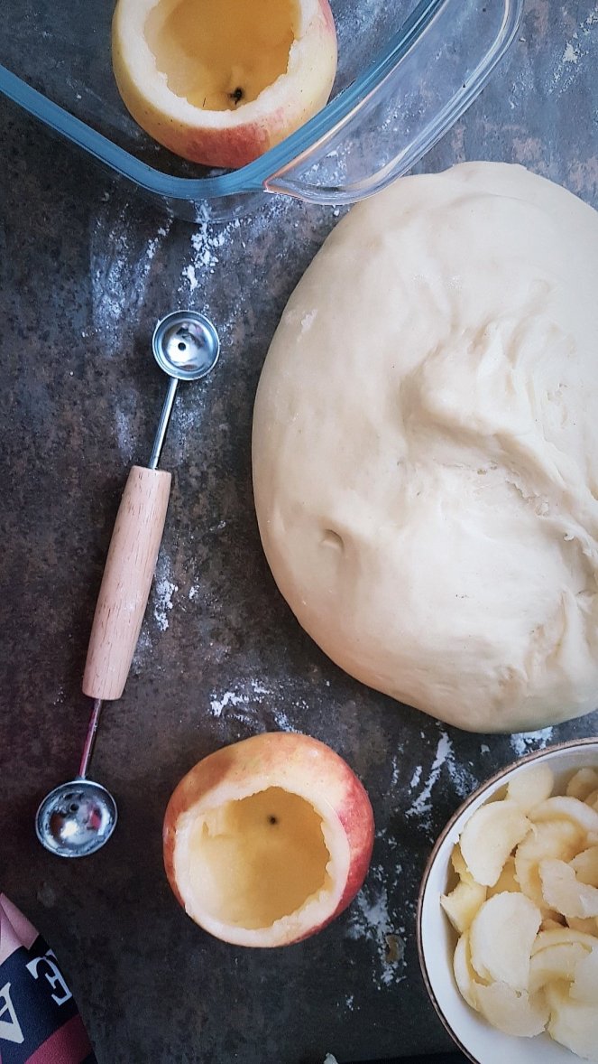 Manchmal sind mir die Cinnamon Rolls zu trocken. Ich möchte aber trotzdem etwas Fett einsparen und kam auf die Idee, Bananenstreifen vor dem Rollen einzuarbeiten uuuuund die ganze Schnecke in einen Apfel zu stopfen. Der Apfel gibt auch nochmal etwas mehr Feuchtigkeit und macht das Ganze sehr soft und cremig. So, wie ich es mag.