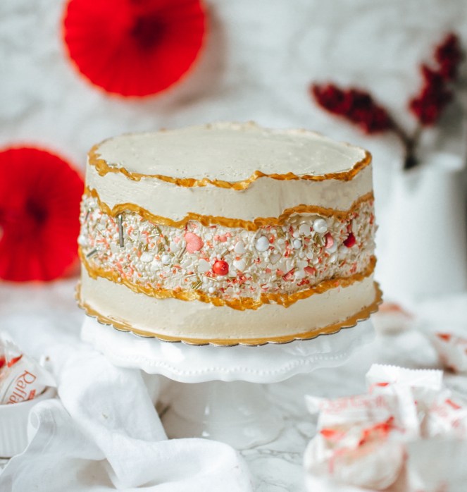 Als erstes gibst du die American Buttercream in einen Spritzbeutel mit großer Tülle und spritzt die Masse an den äußeren Rand des Tortenbodens. Mittig gibst du dann die Raffaellocreme drauf, bis alles ausgefüllt ist. Verteile auf die Creme reichlich Pfirsichstücke und zerdrücke ca. 3 Raffaelos darüber. Fahre so nun Schicht für Schicht fort.