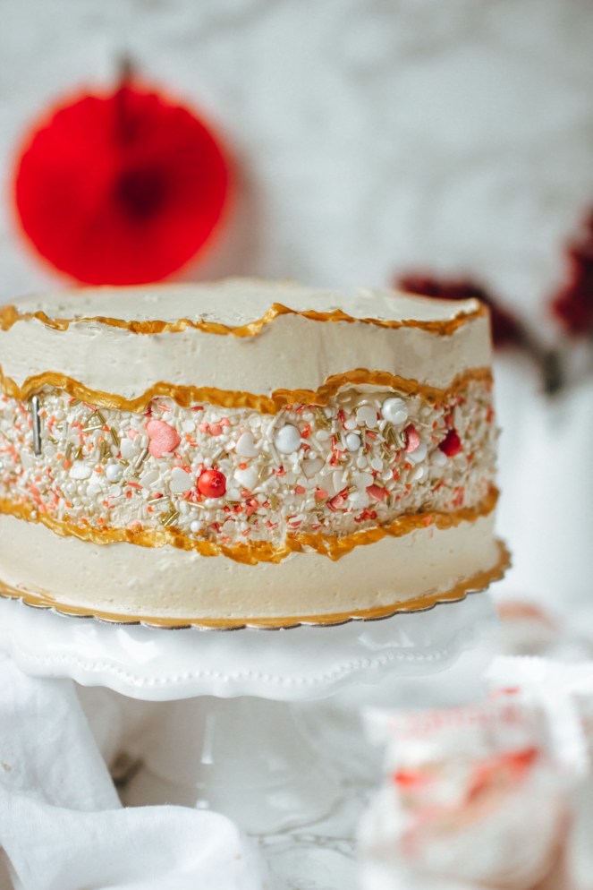 Lege ein Backblech unter die Tortenplatte, sodass die Streusel aufgefangen werden können. Dann mittig die Streusel andrücken & die Torte für weitere 30Min. kühlen.