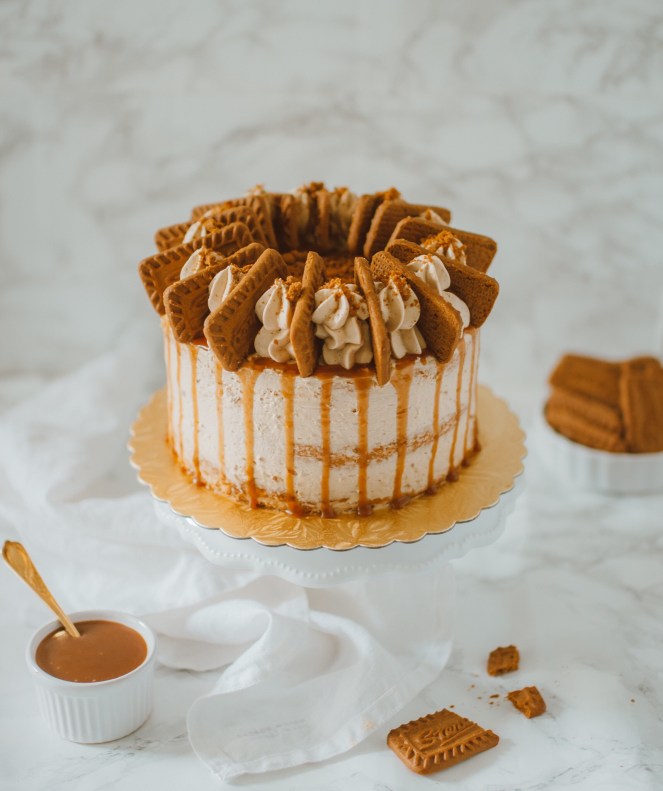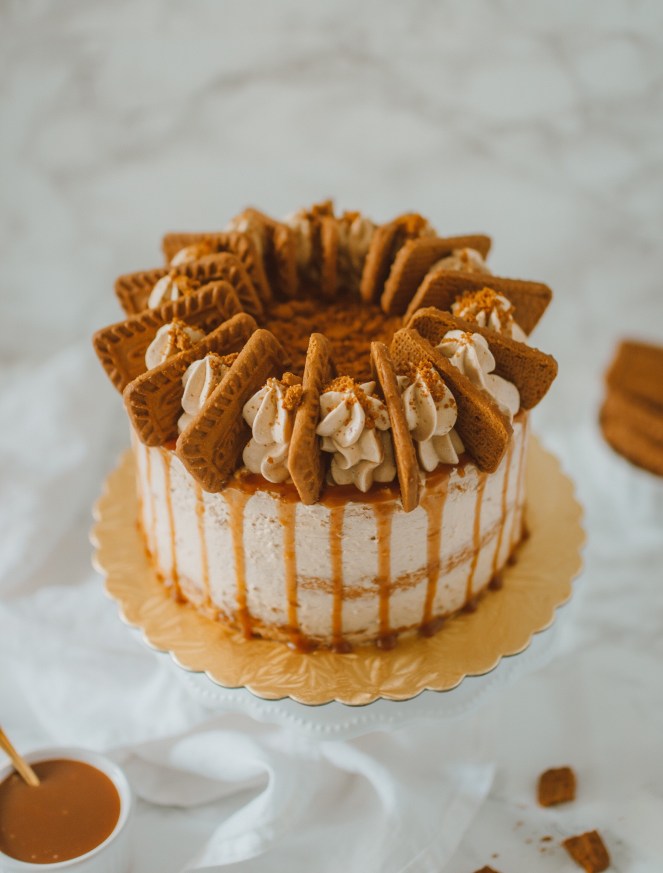Auf den ersten Tortenboden streichst du mit Hilfe einer Winkelpalette die Biscoff Karamellcreme auf. Dann gibst du ca.1 Esslöffel Salted Karamell auf die Creme und toppst das Ganze mit zerbröselten Keksen. So verfährst du Schicht für Schicht und streichst die Torte anschließend komplett mit der Creme ein.