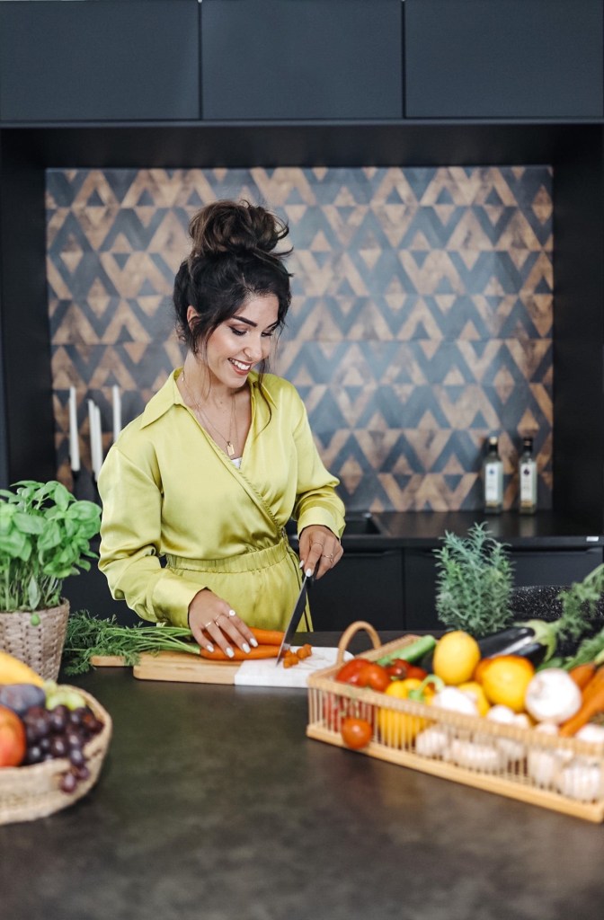 Bevor man so ein Buch in den Druck gibt, muss natürlich ein Cover und eine Headline her. Ich wusste schon wirklich genau, wie das Buch aussehen sollte. Ziemlich clean, ausdrucksstark aber auch nicht zu hart. Ich durfte meine Bilder in einem Küchenstudio shooten und kreierte somit mein Cover und alle weiteren Bilder von mir dort selbst. Ich überlegte mir vorher Szenarien, die ich fotografieren möchte und plante dafür Outfits und Rezepte. Ich habe mir vor Ort selbst noch verschiedene Frisuren gezaubert ( Vorteil wenn man Friseurin ist) und mein Make – up an die Szenarien angepasst.Ich hatte hier meine Schwester dabei, die z.B. meine Haare etwas nachjustieren und Kleinigkeiten an Ort und Stelle bringen konnte. Mit ein wenig Nachbearbeitung hatte ich somit alle Bilder im Kasten und brauchte kein richtiges “ Fotoshooting“.