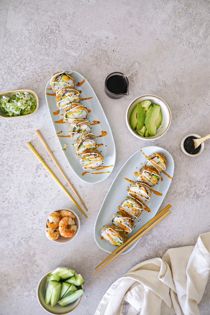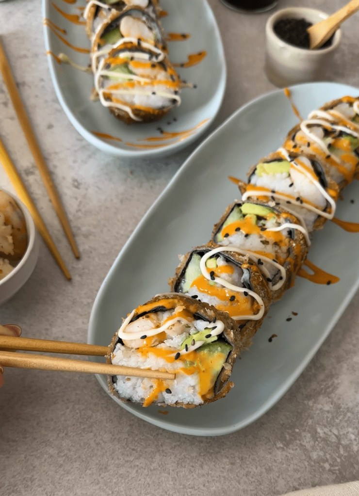 Sushirolle in mundgerechte Stücke schneiden und mit Sriracha Mayo und Mayonnaise toppen. Optional noch etwas schwarzen Sesam on top geben und direkt genießen.