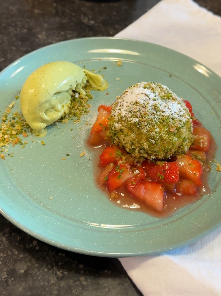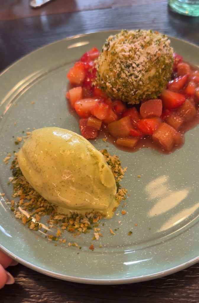 Die Knödel dazu anrichten und mit je einer Kugel Eis und den Minzspitzen fertigstellen.