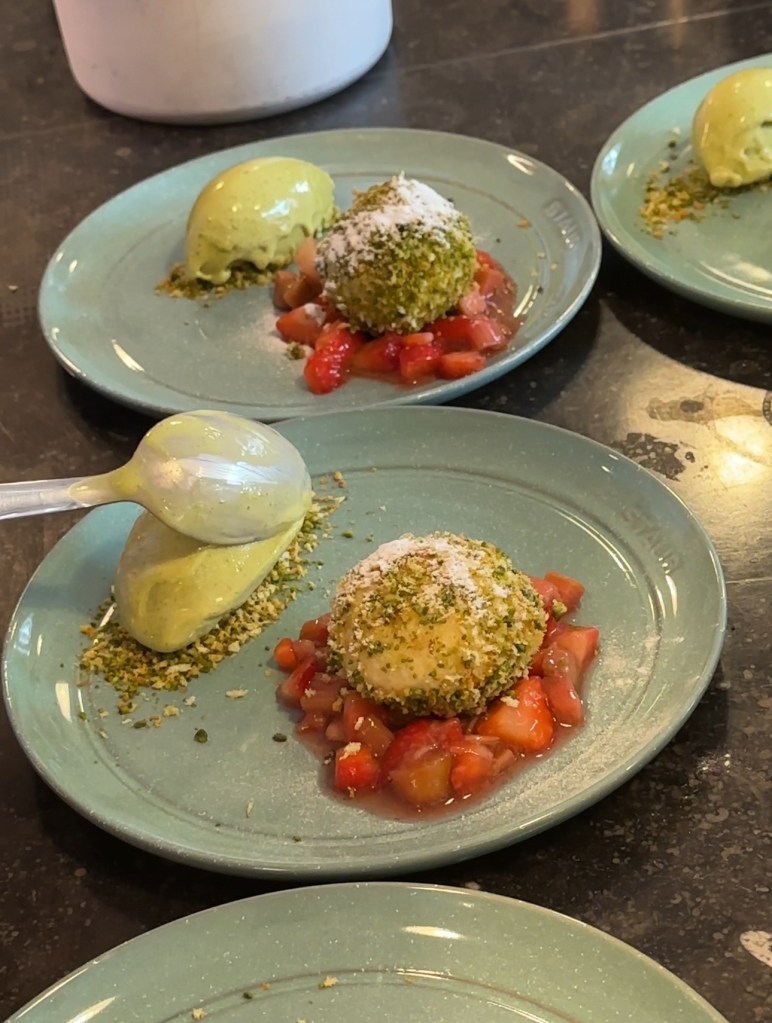 Pistazienkerne fein hacken. Panko Paniermehl in einer Pfanne unter Rühren goldbraun anrösten. Mit den Pistazien mischen. Knödel aus dem Wasser nehmen, abtropfen lassen und in der Mischung wälzen.