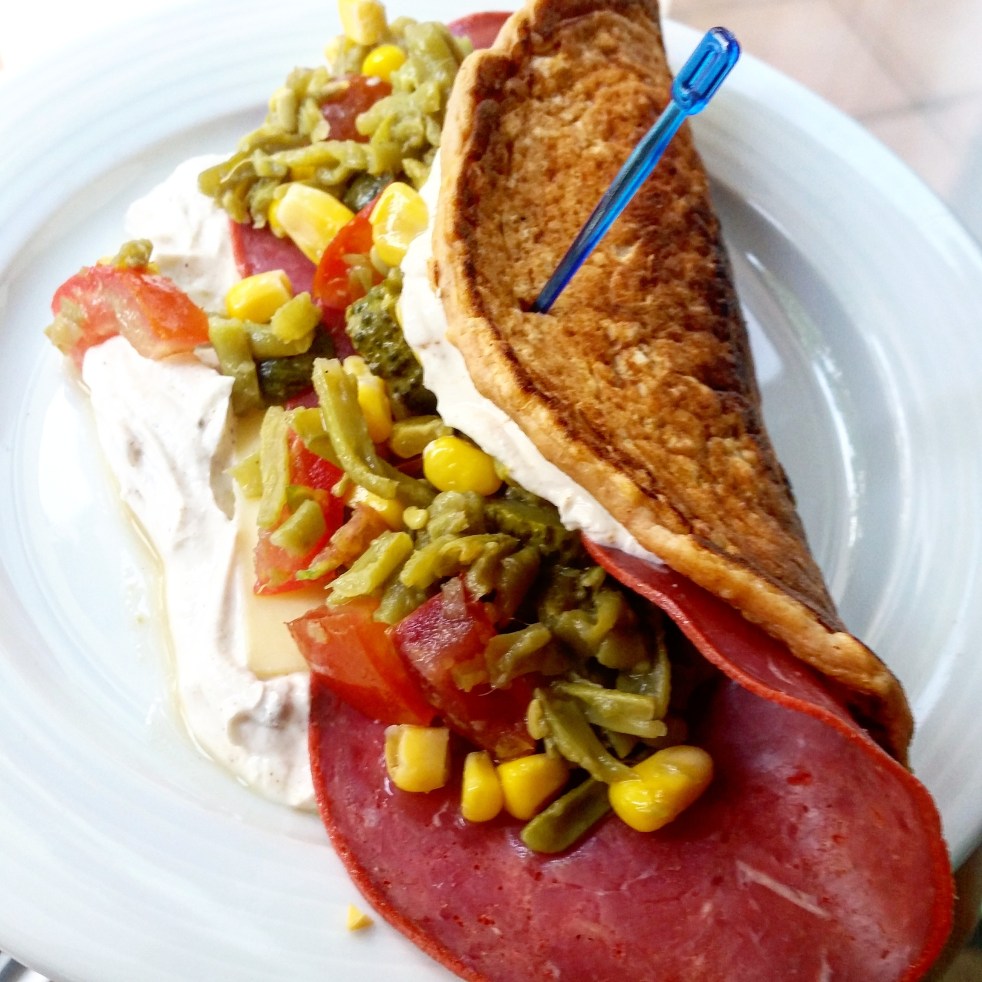 Gesundes kann so lecker sein!Die tomatige Variante gibt deinem Wrap das gewisse Extra! Der Wrap inkl. Quarkdip+Füllung hat 328kcal/ 39g EW/ 24g KH/ 9g F REZEPT: 1Ei 20g Schmelzflocken 1EL Tomatenmark 1EL Magerquark Salz.Pfeffer.Knoblauchgewürzpulver.Paprikagewürz. Für die Füllung: 1EL Mais 3 Scheiben Rinderschinken(Pastirma) 1EL Bohnen 1/2 Tomate Für den Dip: 2EL Magerquark etwas Salz Schuss Wasser… Weiterlesen Tomatenwrap